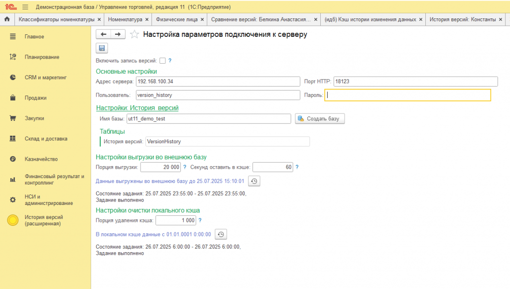 Интерфейс настройки параметров подключения подсистемы Истории Версий. Включает поля для ввода адреса сервера, учетных данных (логин и пароль), имени базы данных и целевой таблицы